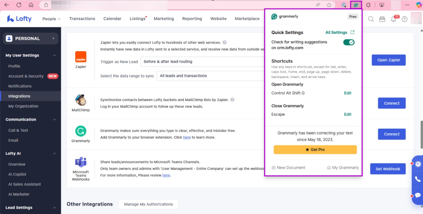 Access Grammarly via Lofty