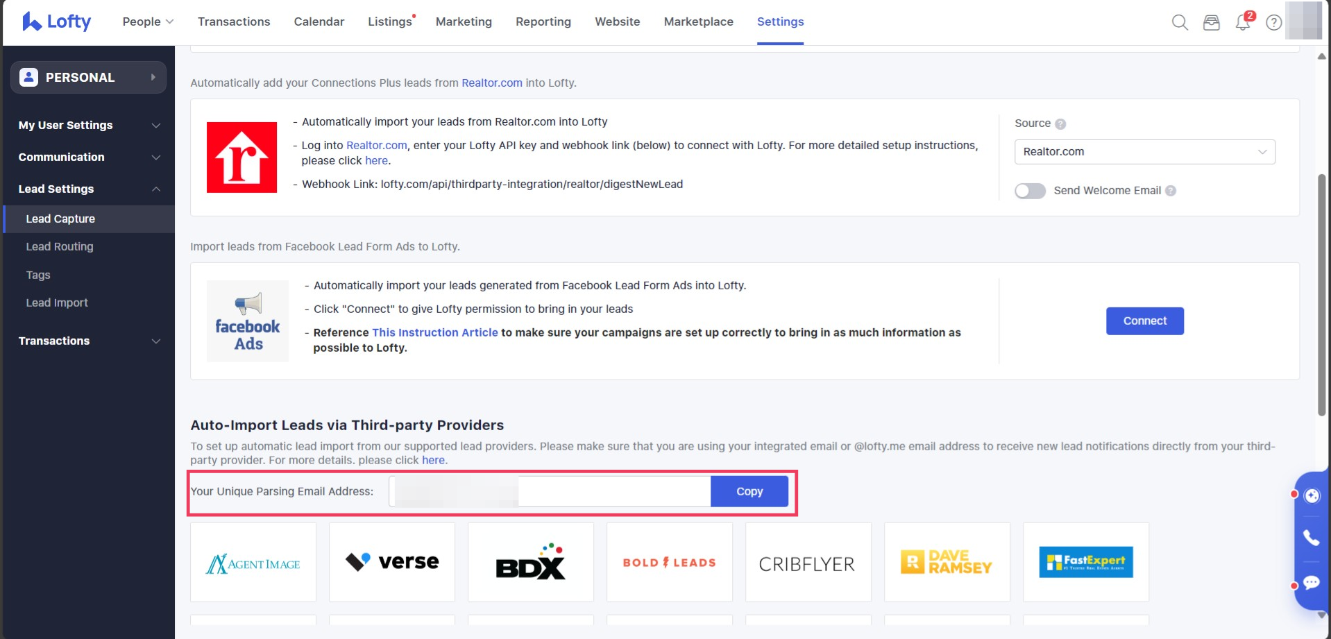 At the bottom of this page, you will find the option to auto-import leads via third-party providers. Here, you will see your Lofty email, which you will use to auto-import leads from Realtor.com. In this section, click the Copy.