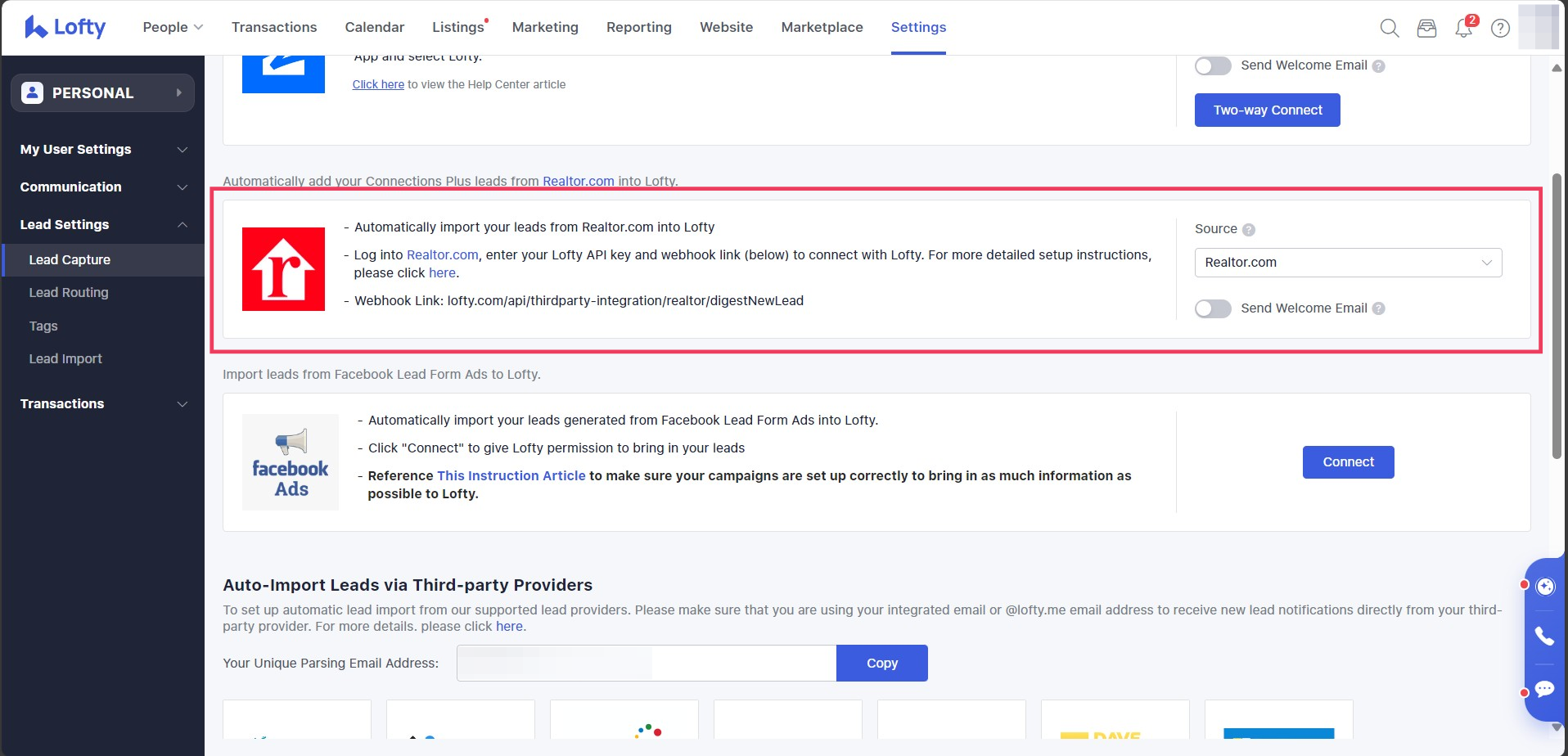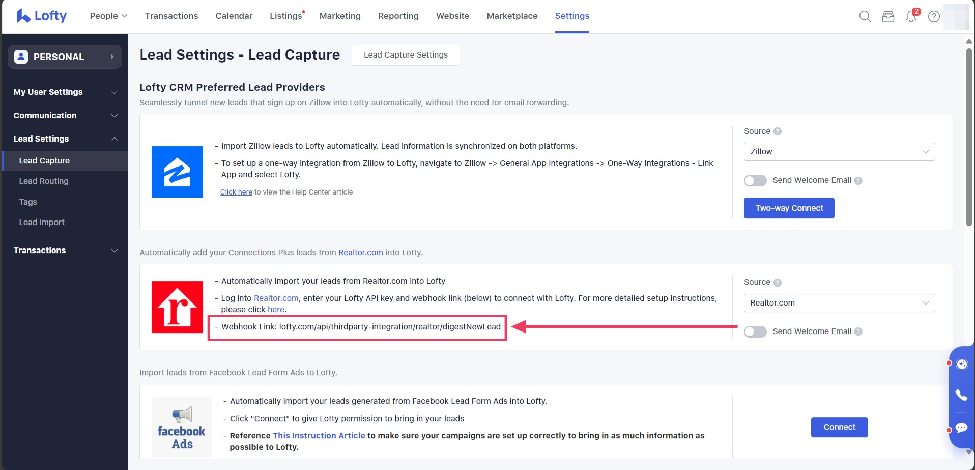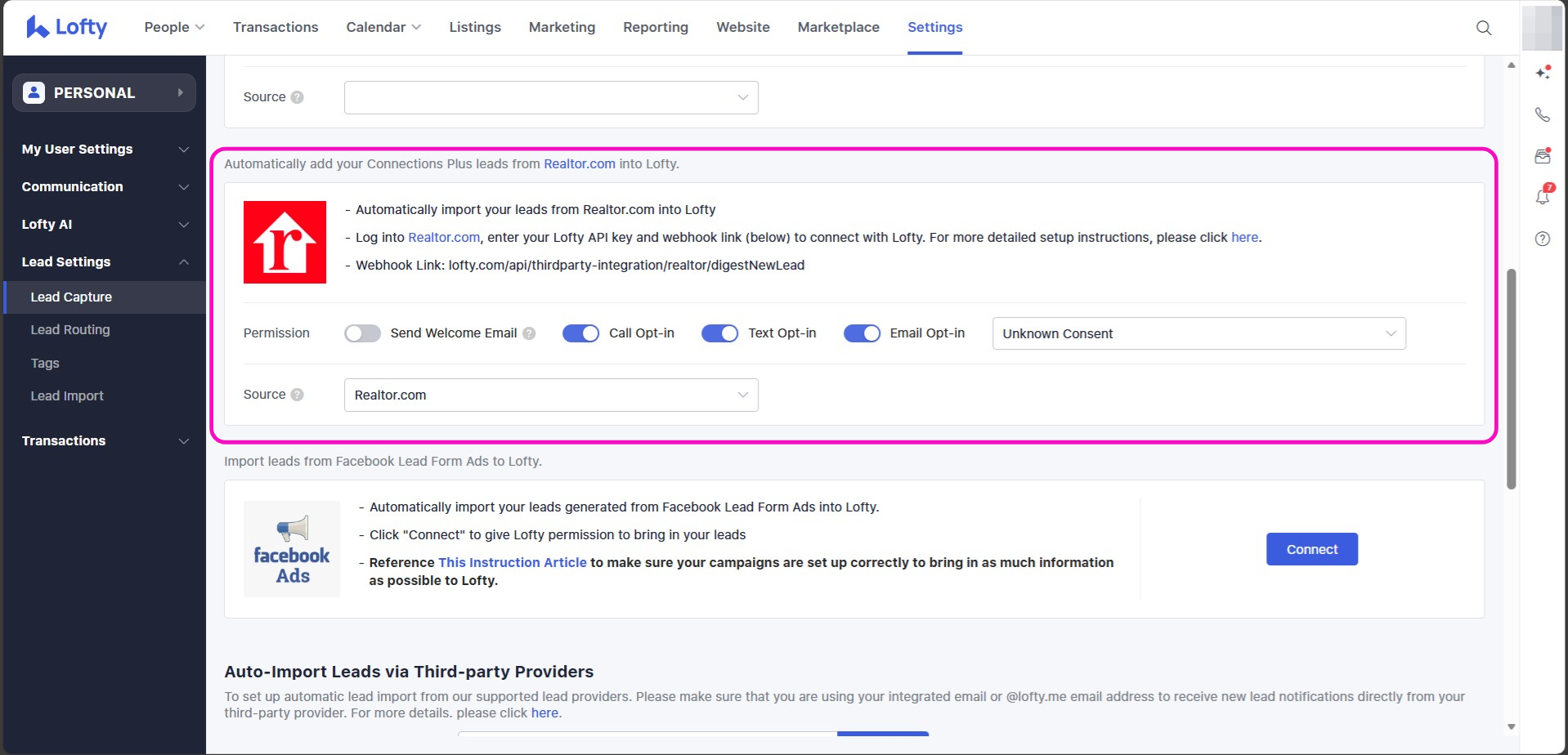 This connection is found under Settings >Lead Settings > Lead Capture > Lofty CRM Preferred Lead Providers: