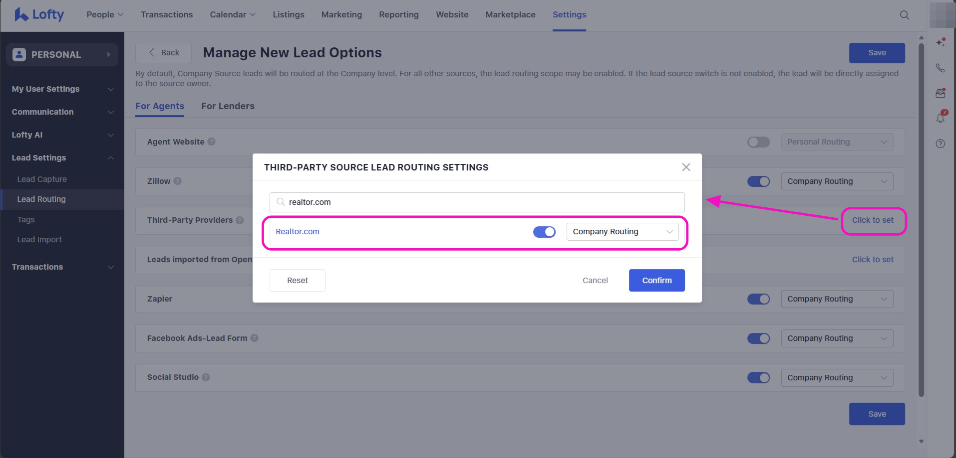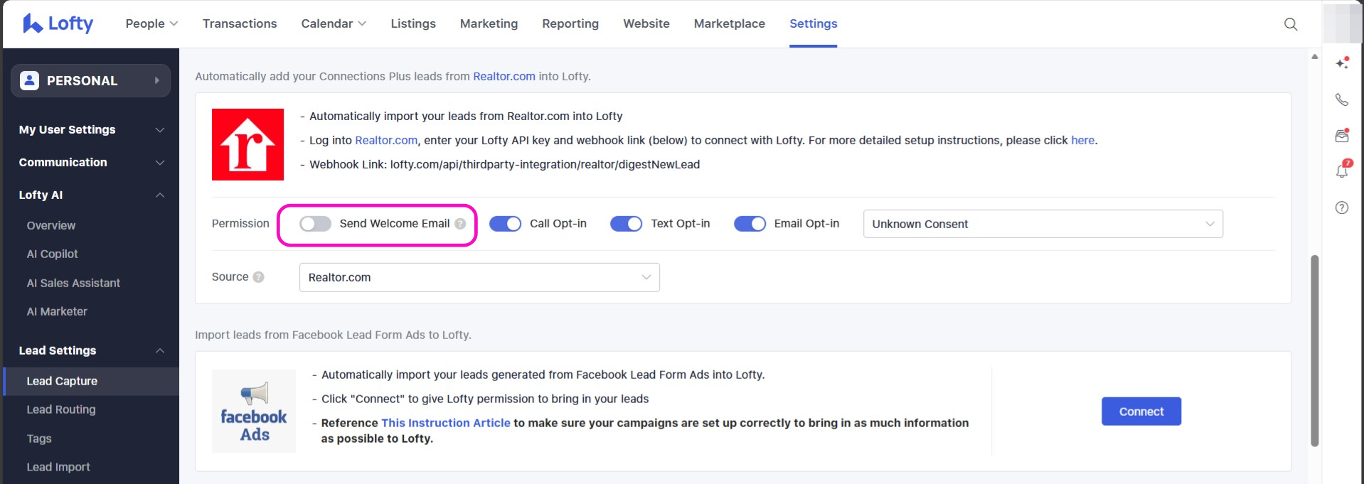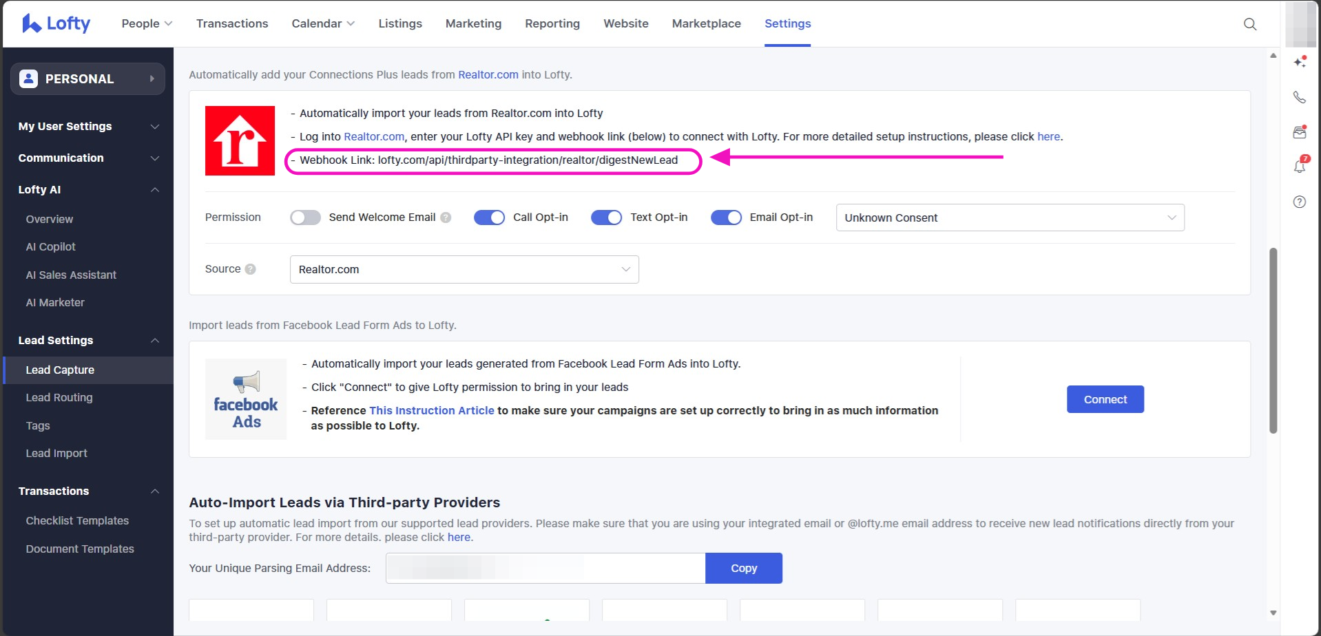 This connection is found under Settings >Lead Settings > Lead Capture > Lofty CRM Preferred Lead Providers: