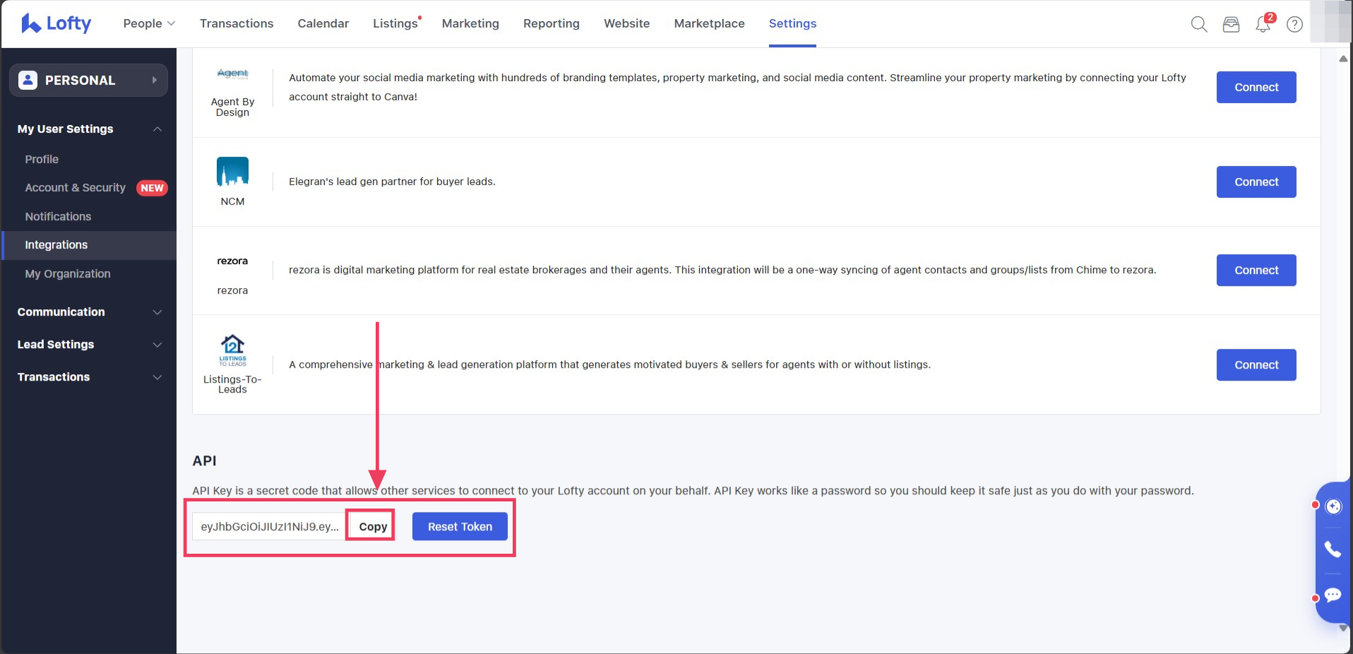 3. For "API Key," copy the key found in Lofty under Settings > Features > Integrations > API (at the bottom):