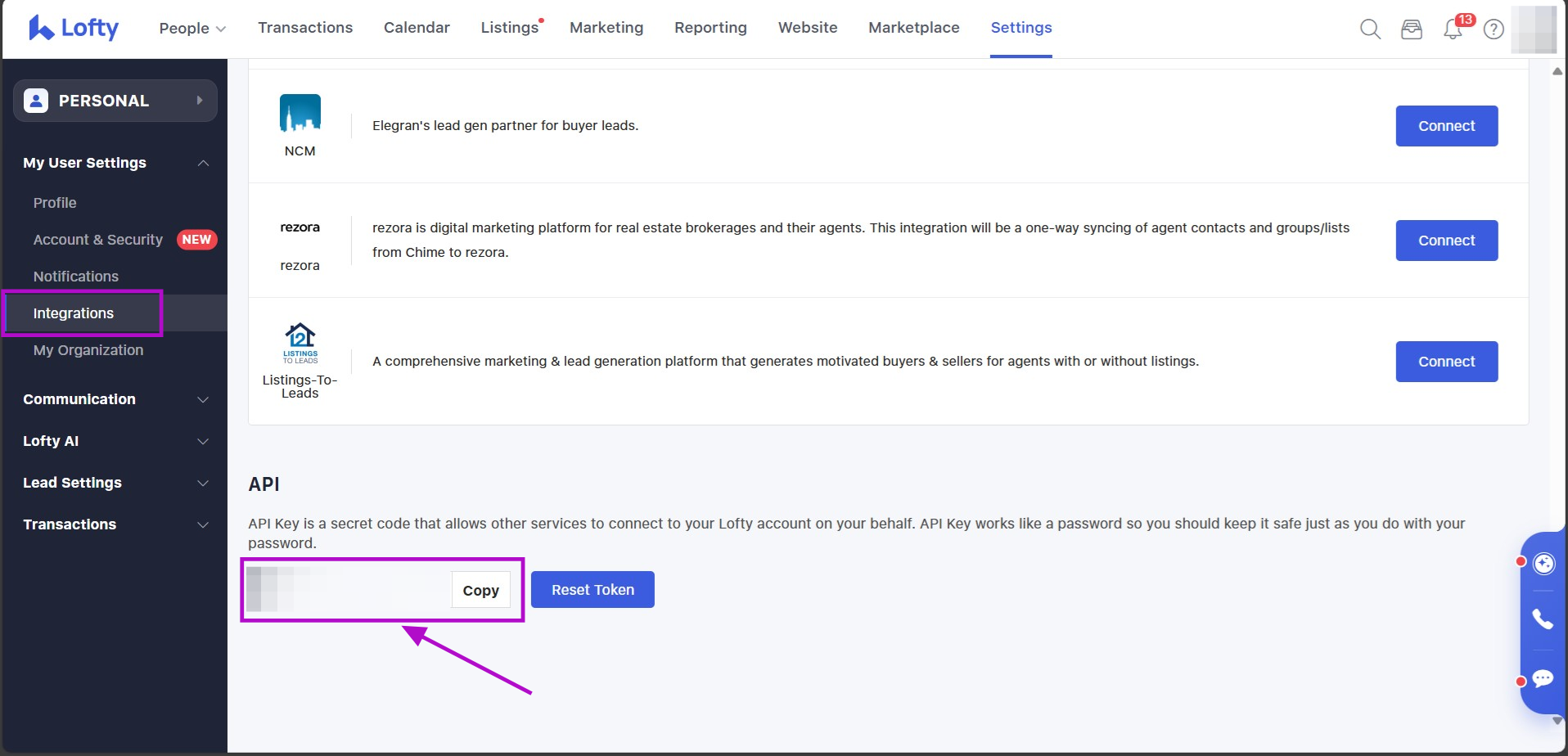 - Once you have the Lofty API Key, go to your Realty.com portal located at: https://portal.realty.com.