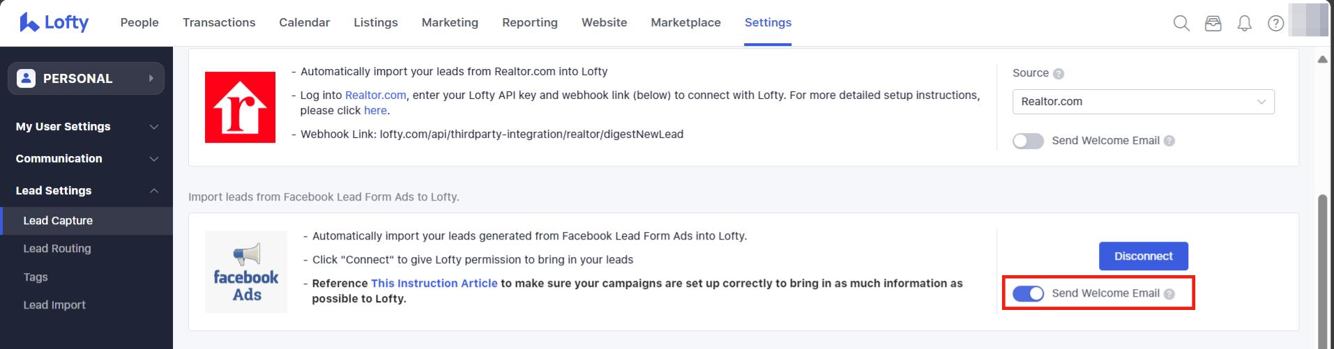 One potential solution to this is to send the leads to a landing page with an explanation of your services and let them know they will be receiving a Welcome Email that they can use to browse your site. You would want to consider locking down the landing page so that no navigation menu appeared, etc. so that they were forced to find the email. This method allows for the lead's continued activity on your website to be tracked and recorded on their lead profile page in Lofty. Here is where you would turn on the option to "Send Welcome Email" under Settings > Integrations > Facebook Ads. More information regarding the Welcome Email can be found here: Set Up the Welcome Email. Keep in mind that Welcome Emails, if turned on, are for all leads from any source, not just one in particular.