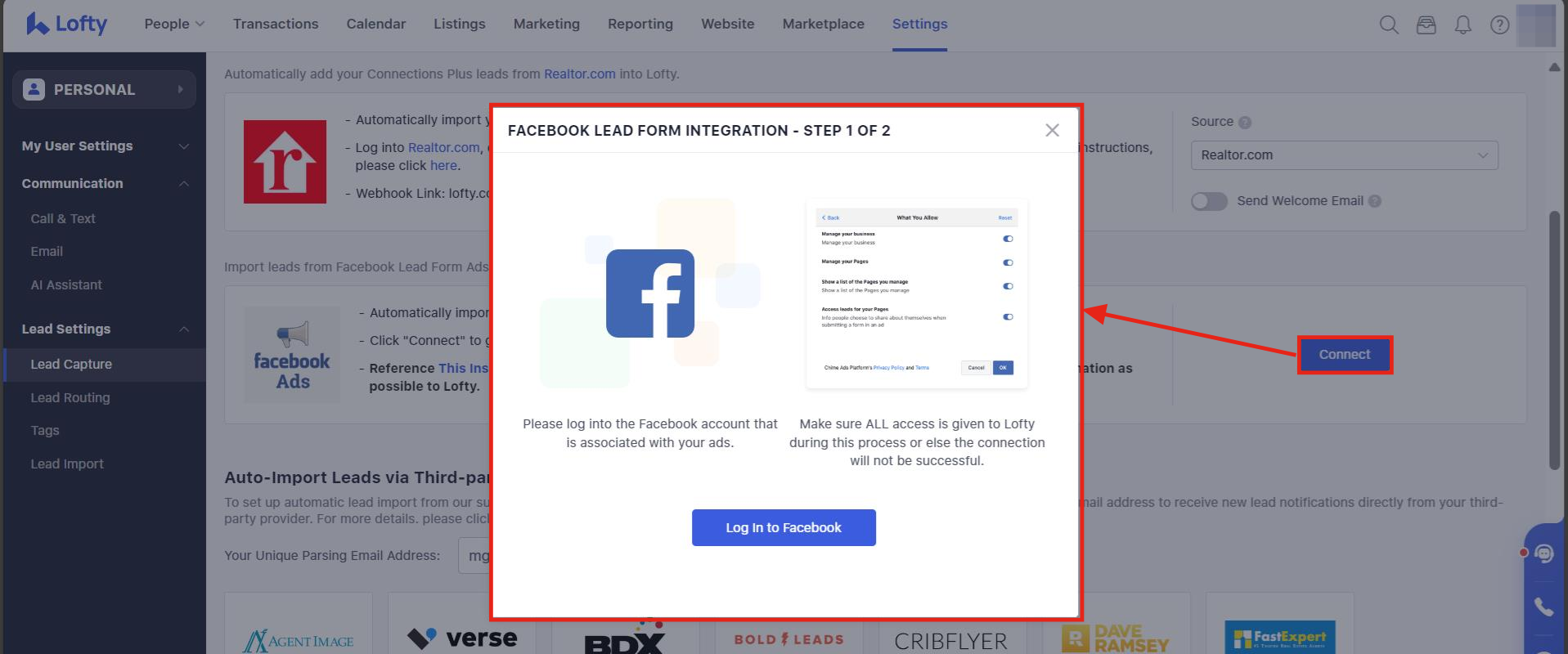 Navigate to Personal Settings > Lead Capture > Facebook Ads > Connect: