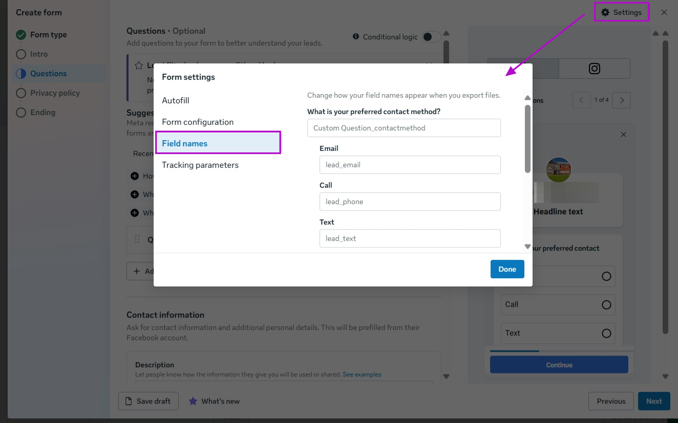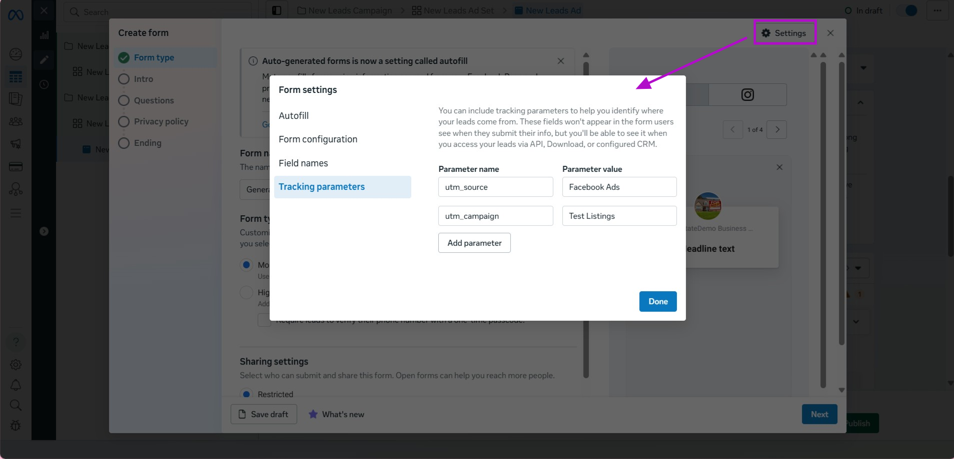 You will add the information gathered in the Criteria Preparation step as UTM Tracking Parameters on the Facebook lead form. To find those settings, do the following: