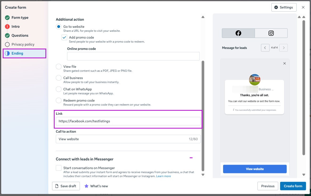 (2) Check the Facebook Lead Ads testing tool for any errors