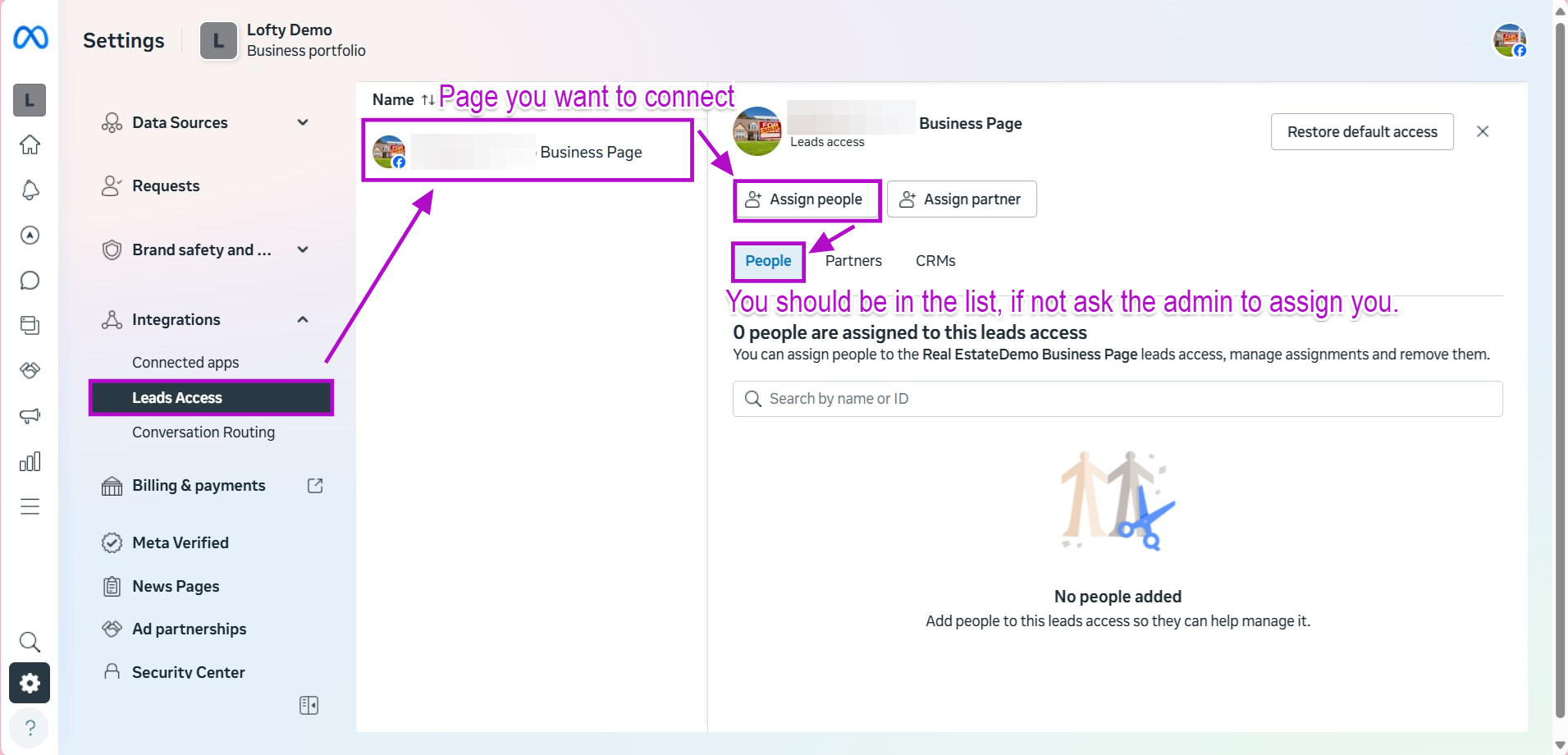 - Navigate to the page you connected to Lofty under the Leads Access Tab -https://business.facebook.com/settings/leads-accesses