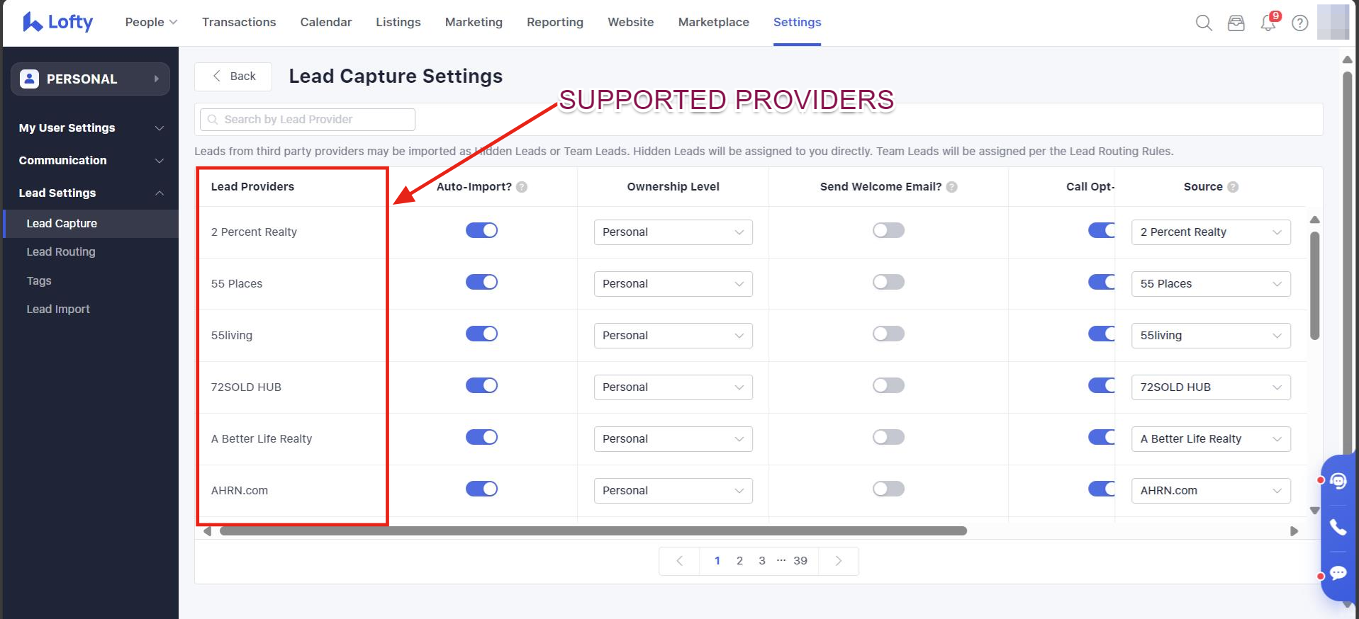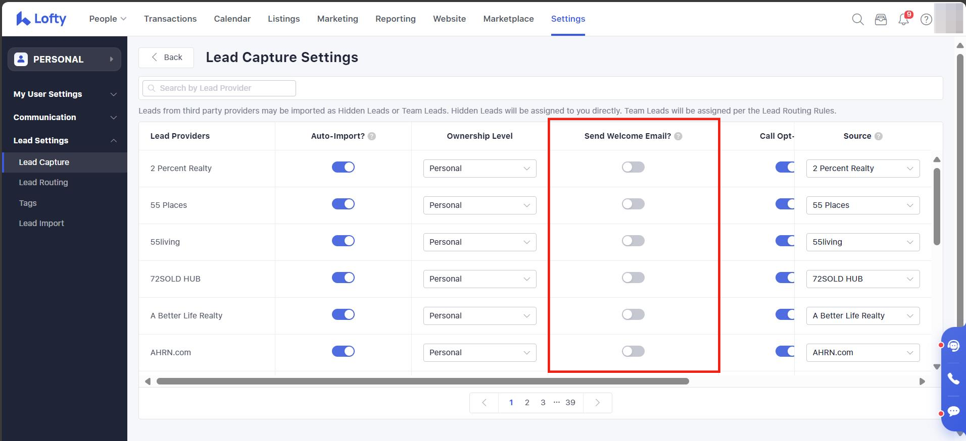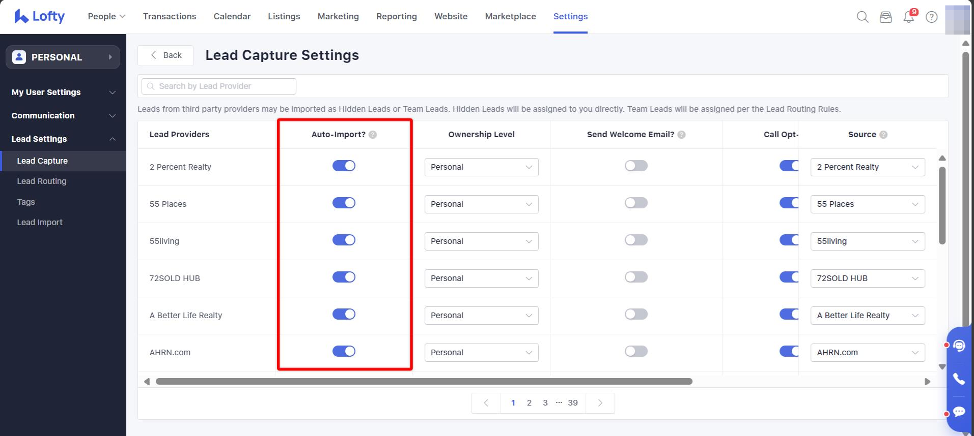 Toggle the switch in the "Auto-Import" column on/off depending on whether you would like leads from these sources to be parsed into Lofty. They will be ON by default: