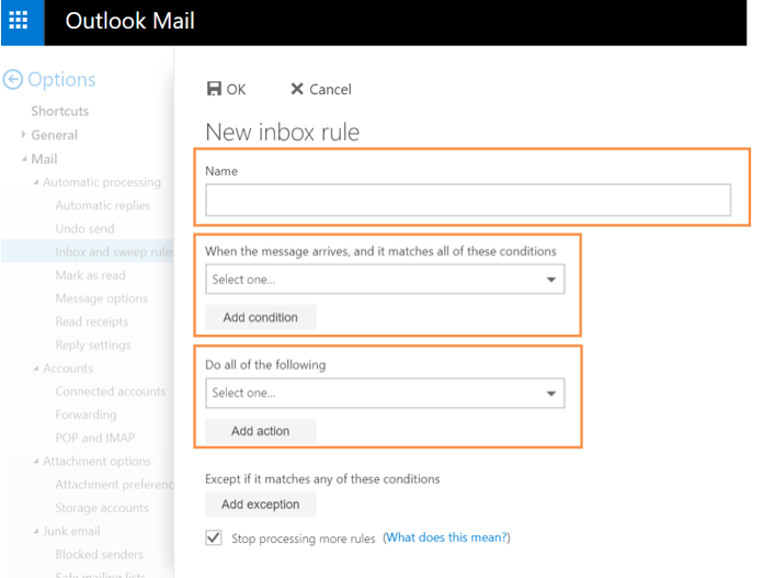 4. Here you can set the Name, and add Conditions and Actions to the rule. The Conditions you set will filter your emails.