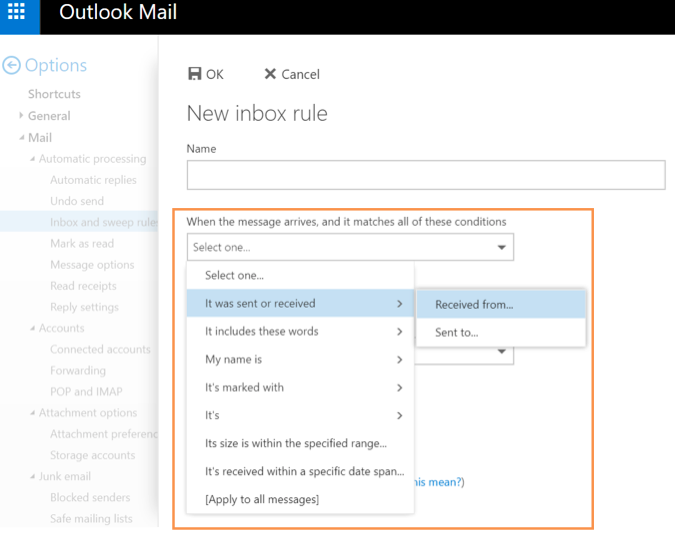 6. Filter your email by adding Conditions such as Received from and include these words.