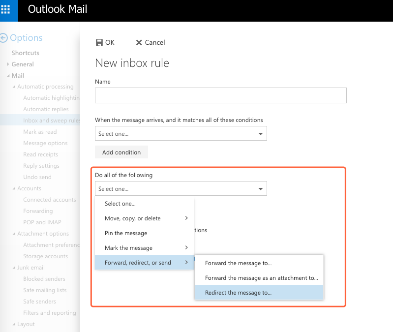 5. Emails fitting the criteria you have set in the Conditions will be forwarded according to the Actions you have added to the inbox rule.