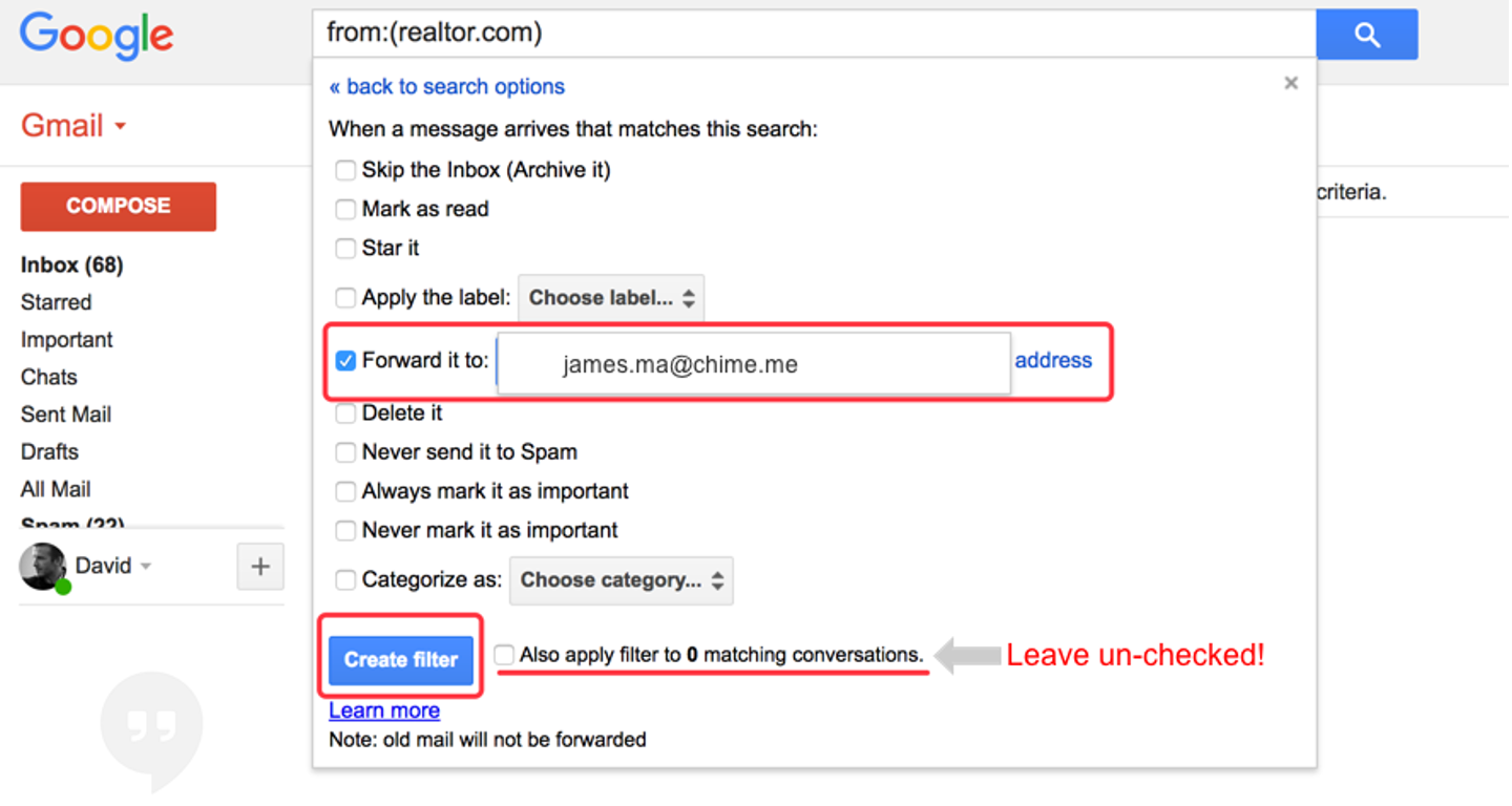 Once you have set up forwarding (the forwarding address must be verified first), you will need to set up a filter to start forwarding only the emails from supported sources to your Lofty CRM.