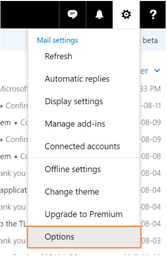 1. Log in to your Exchange account, go to Settings in the top right corner, then click Options.