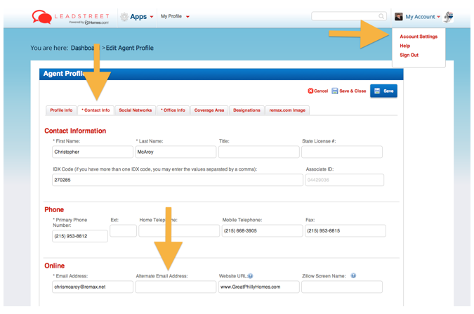 Once within LeadStreet, you can select My Account > Account Settings. Put in your integrated email (in Lofty) in the Email Address or Alternate Email Address option and click Save.