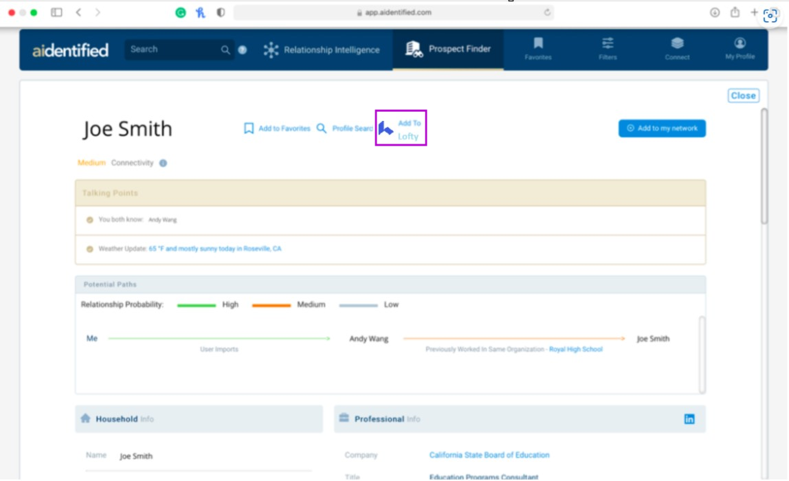 You can easily send a group or individual records to Lofty, by selecting the box to the left of the prospect name and selecting “Add to Lofty”.