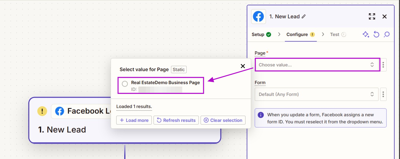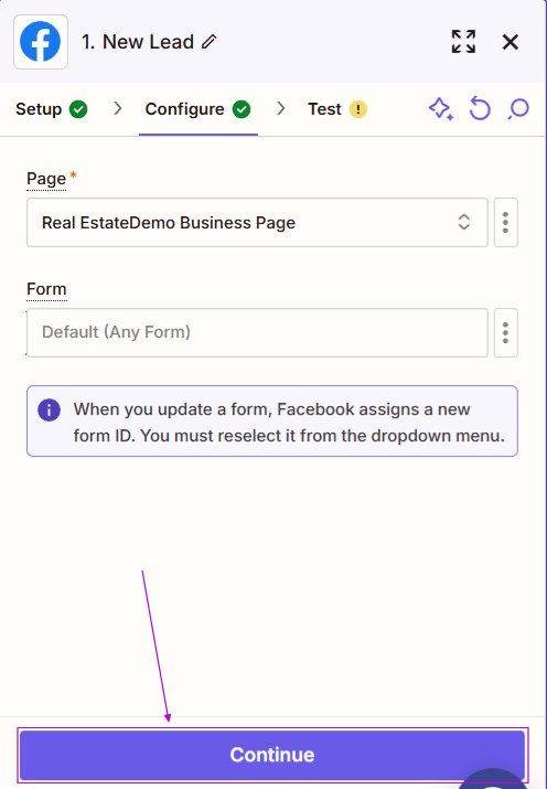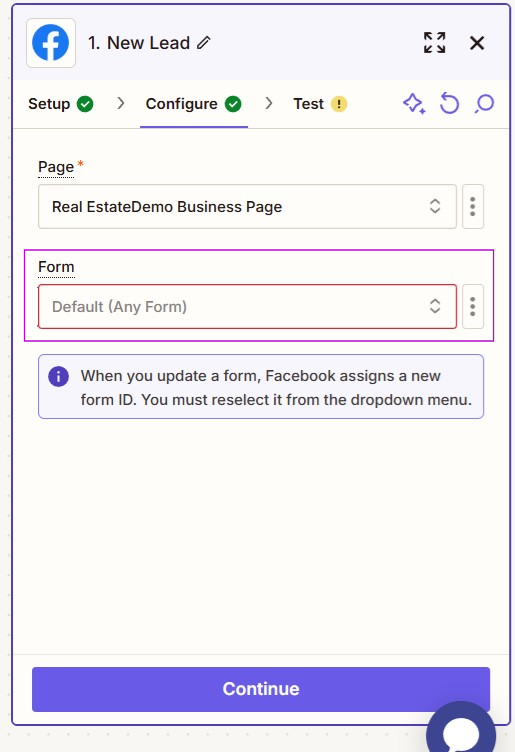 8. Select the form that will be used. If no option is selected, the default is for submissions from "Any Form" on your Facebook business page. The Facebook Ad form must be live in order for Zapier to be able to find it and bring in the right fields.