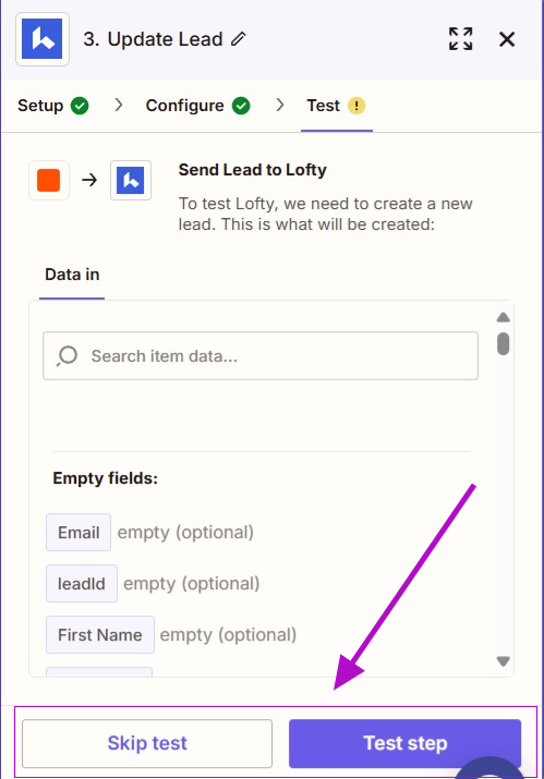 22. You will then be presented with an option to "TEST & REVIEW" or "TEST & CONTINUE." Choose either option or even SKIP TEST in the top right. This would be a good one to test to make sure it creates a lead in Lofty. When testing, it will create a new lead in Lofty that you can watch for.