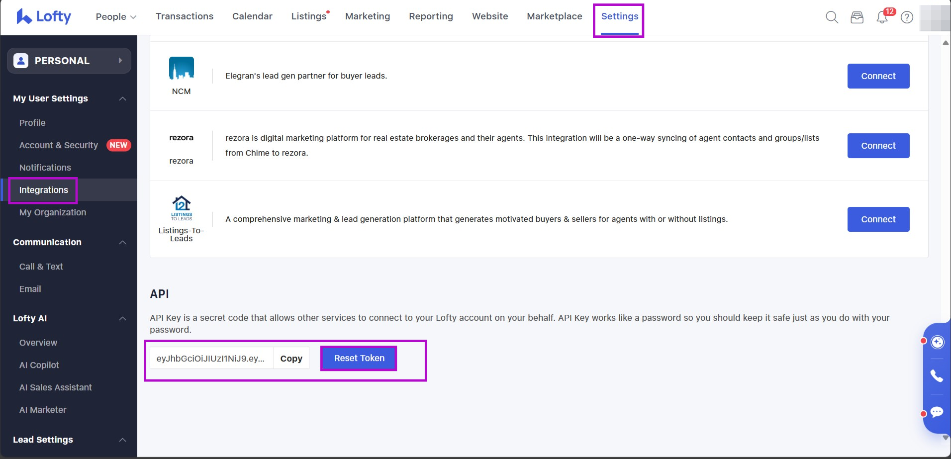 16. While on the Lofty Settings > Integrations, scroll to the very bottom of the page and click on the "Copy" button next to the API key.