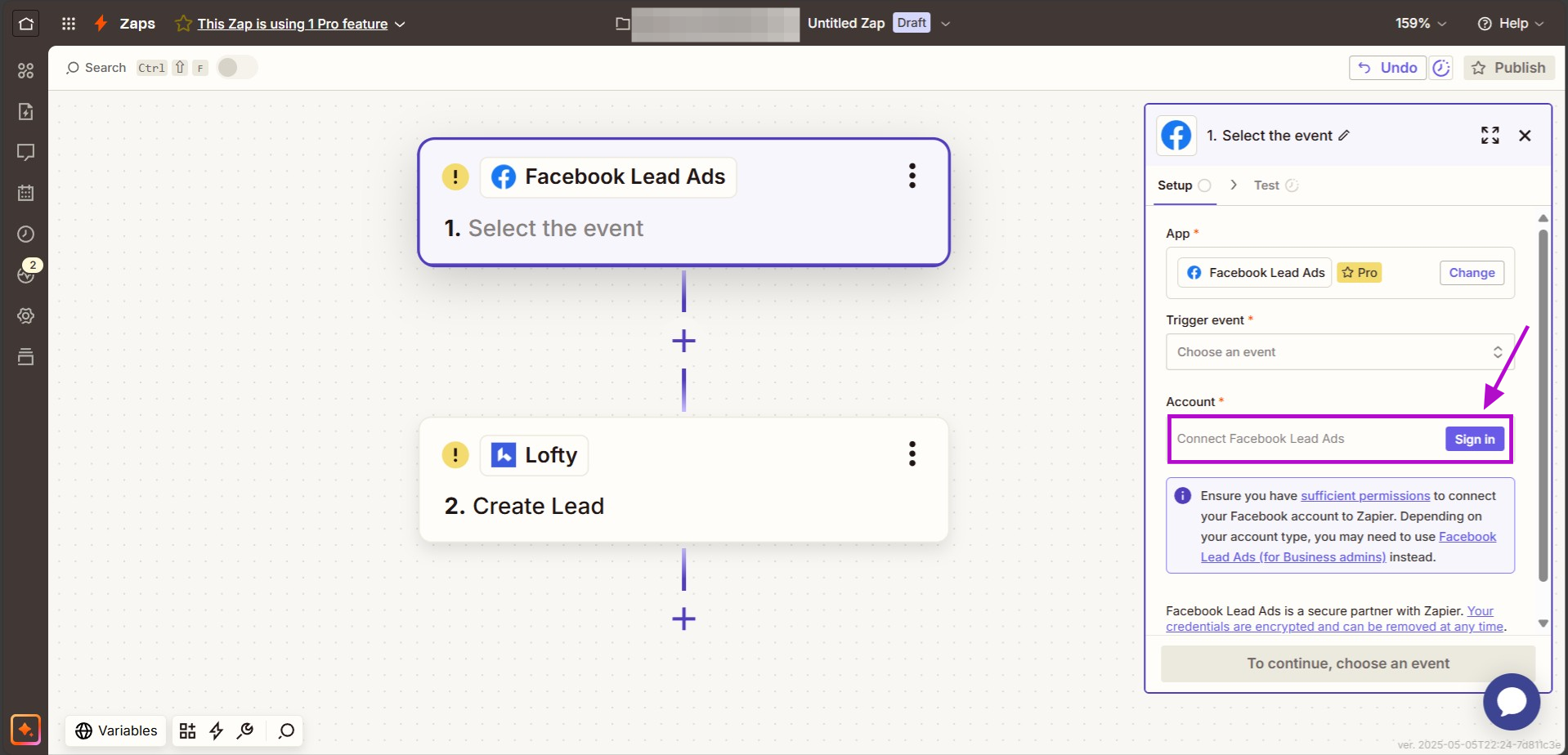 14. If this is the first time you are setting up a zap with Lofty you will need to sign into Lofty and connect via the API key. Click on the option to "Sign in to Lofty."