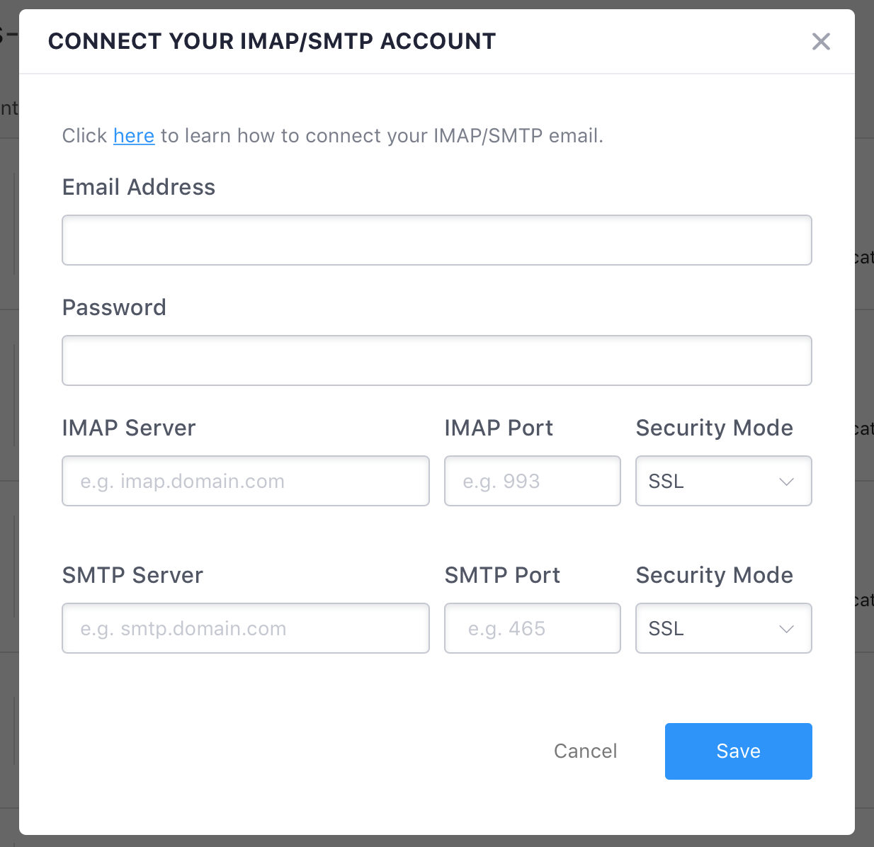 Navigate to Settings > Integrations > IMAP/SMTP, click the "Connect" button and a new window will appear.