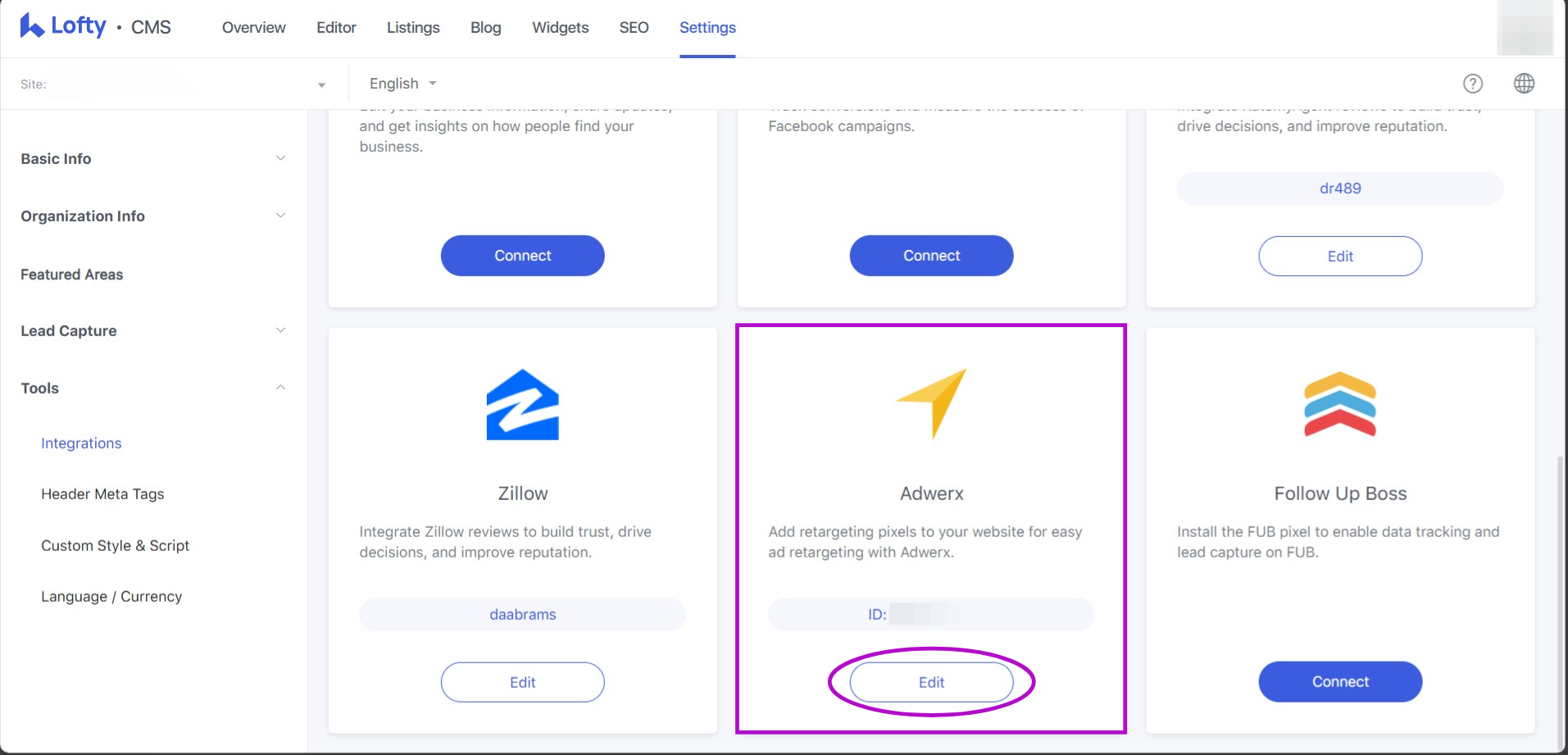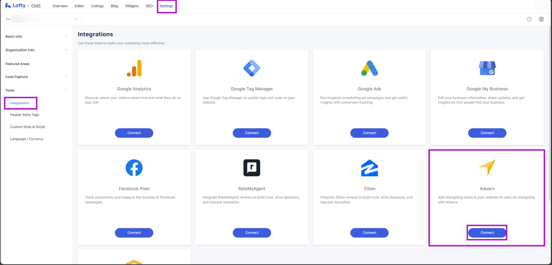 Navigate to Website/CMS Tool → Settings → Tools → Integrations to connect to Adwerx.