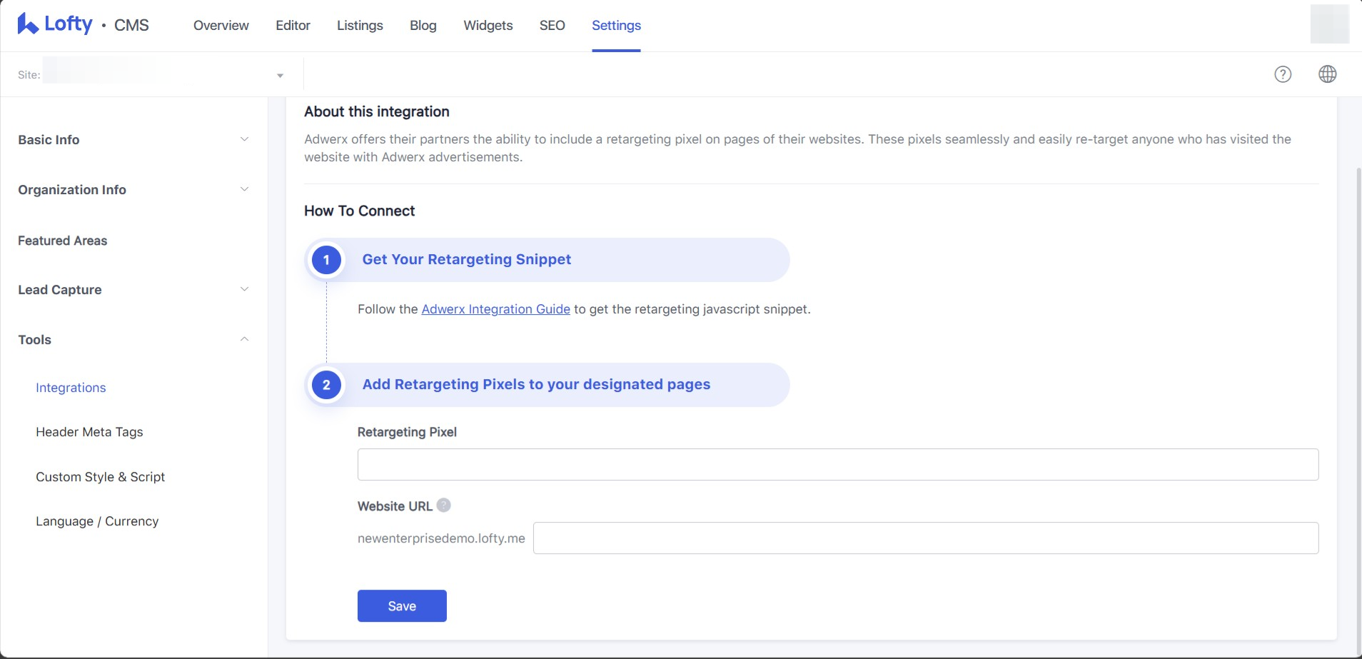 To complete the integration, fill in the retargeting pixel, provided by Adwerx, and the Lofty website URL of a specific page that you want to add the retargeting pixel to.