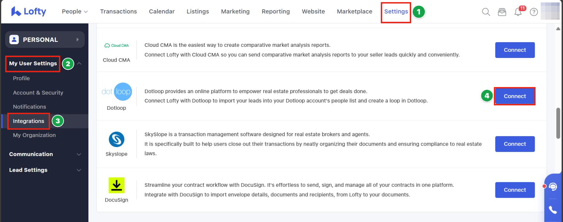 When logged into the Lofty CRM, click Settings > Integrations > Dotloop > Connect: