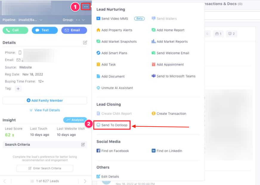 Navigate to the lead profile page and export the lead to Dotloop by clicking the three dots and then selecting the option to "Send to Dotloop":