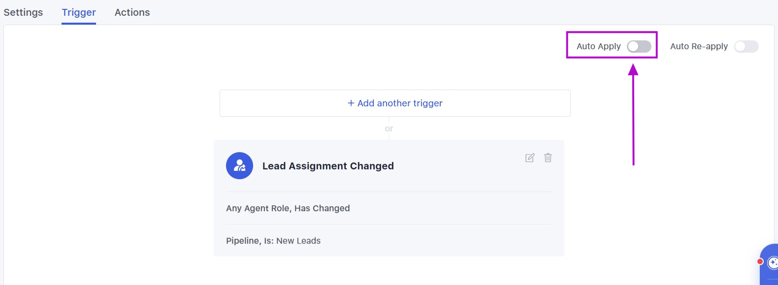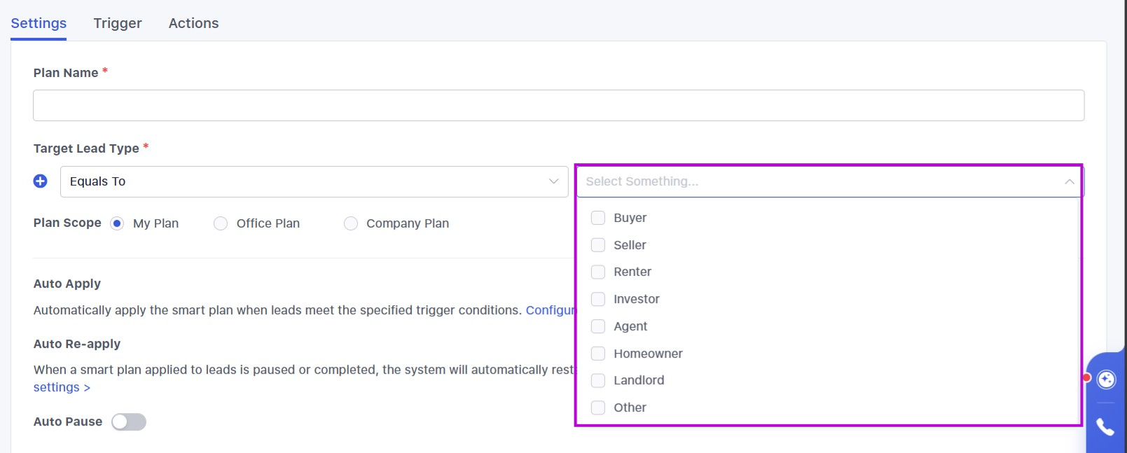 (b) Auto Apply Button. Make sure that the auto-apply button is turned on. This will indicate that the Smart Plan is set up to automatically apply to a lead. If it's not turned on, the plan will not automatically apply.