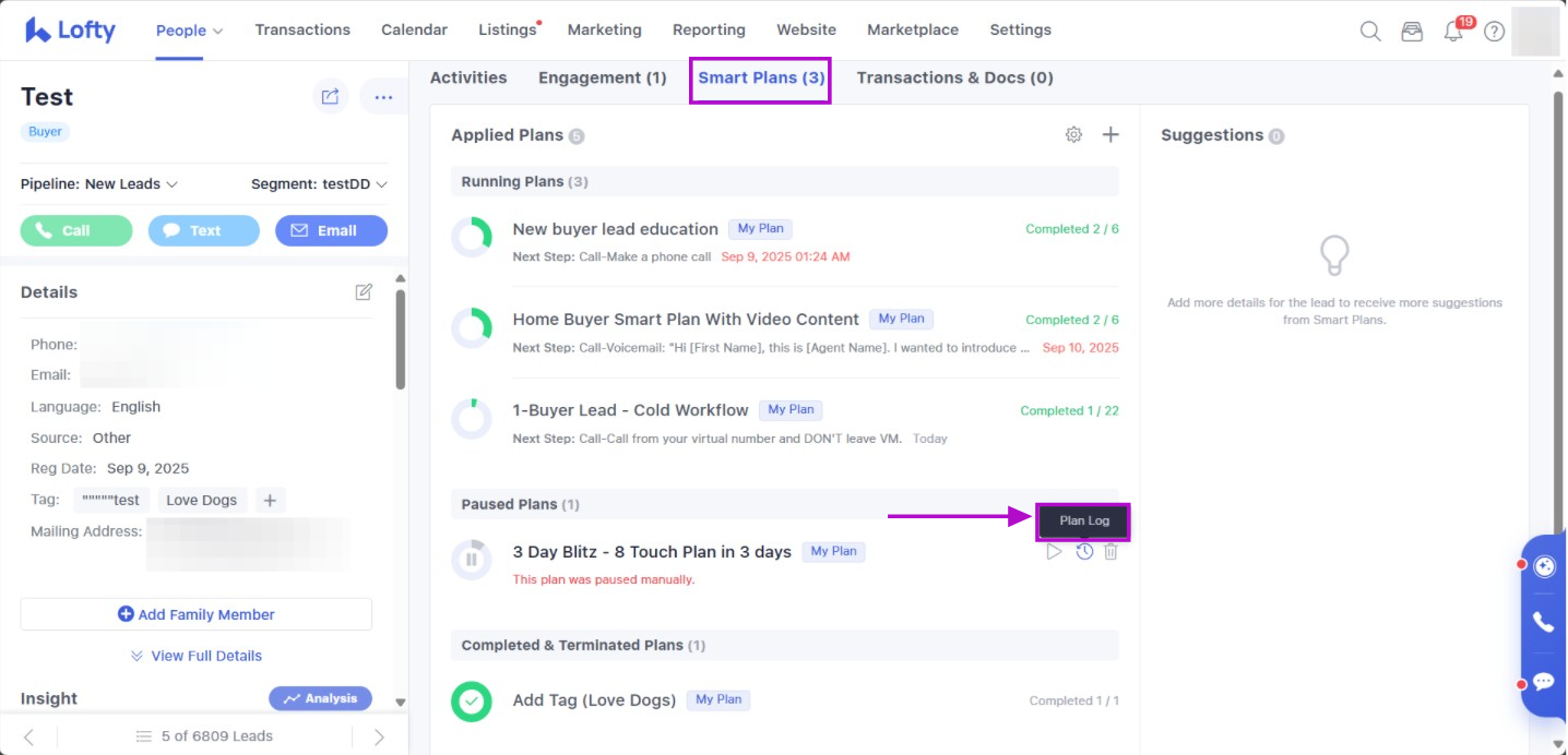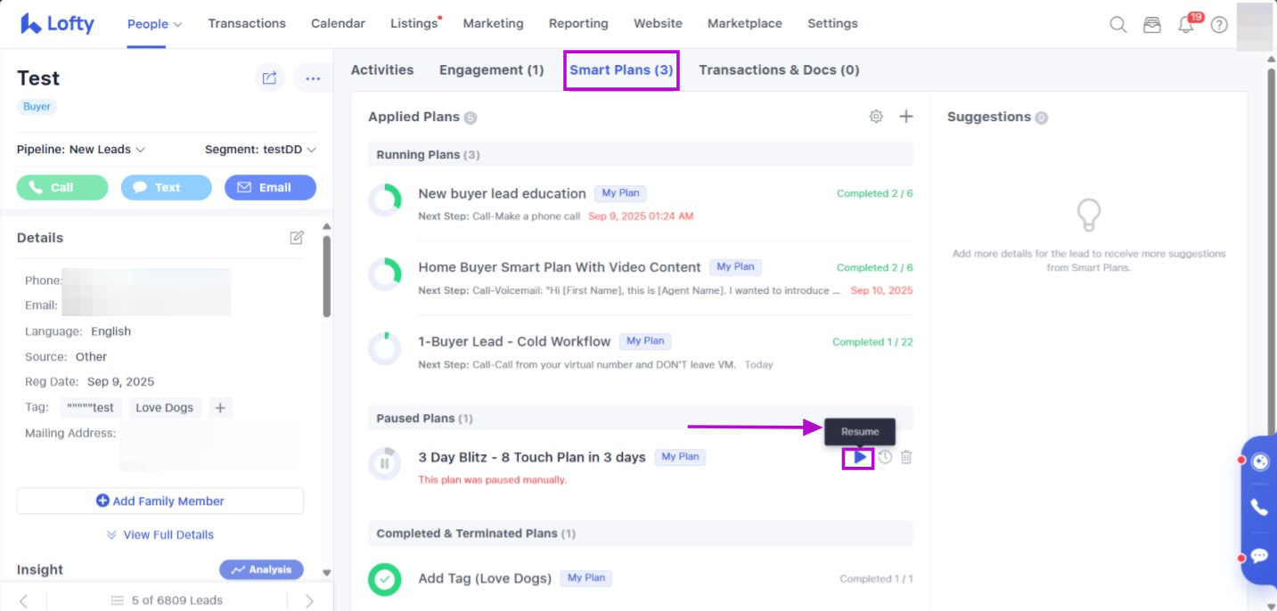 In these situations, you can resume the Smart Plans by navigating to Settings > Features > Smart Plans > Resume. You would then have the option to see how many plans are paused and how many leads they were applied to. You can then resume the plans by clicking the "Resume" button.