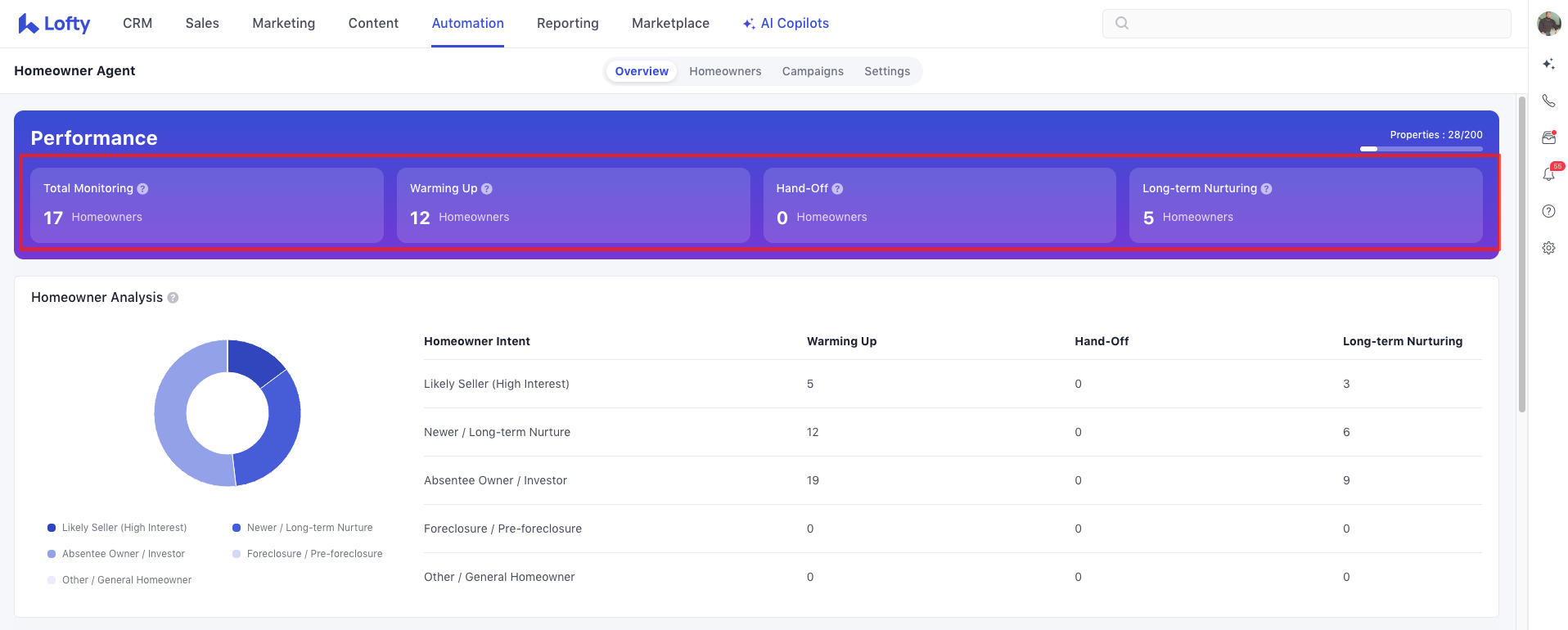 Nurturing status shows how close a homeowner is to reaching out. You can view details for each lead in the Automation → Homeowner Agent section.