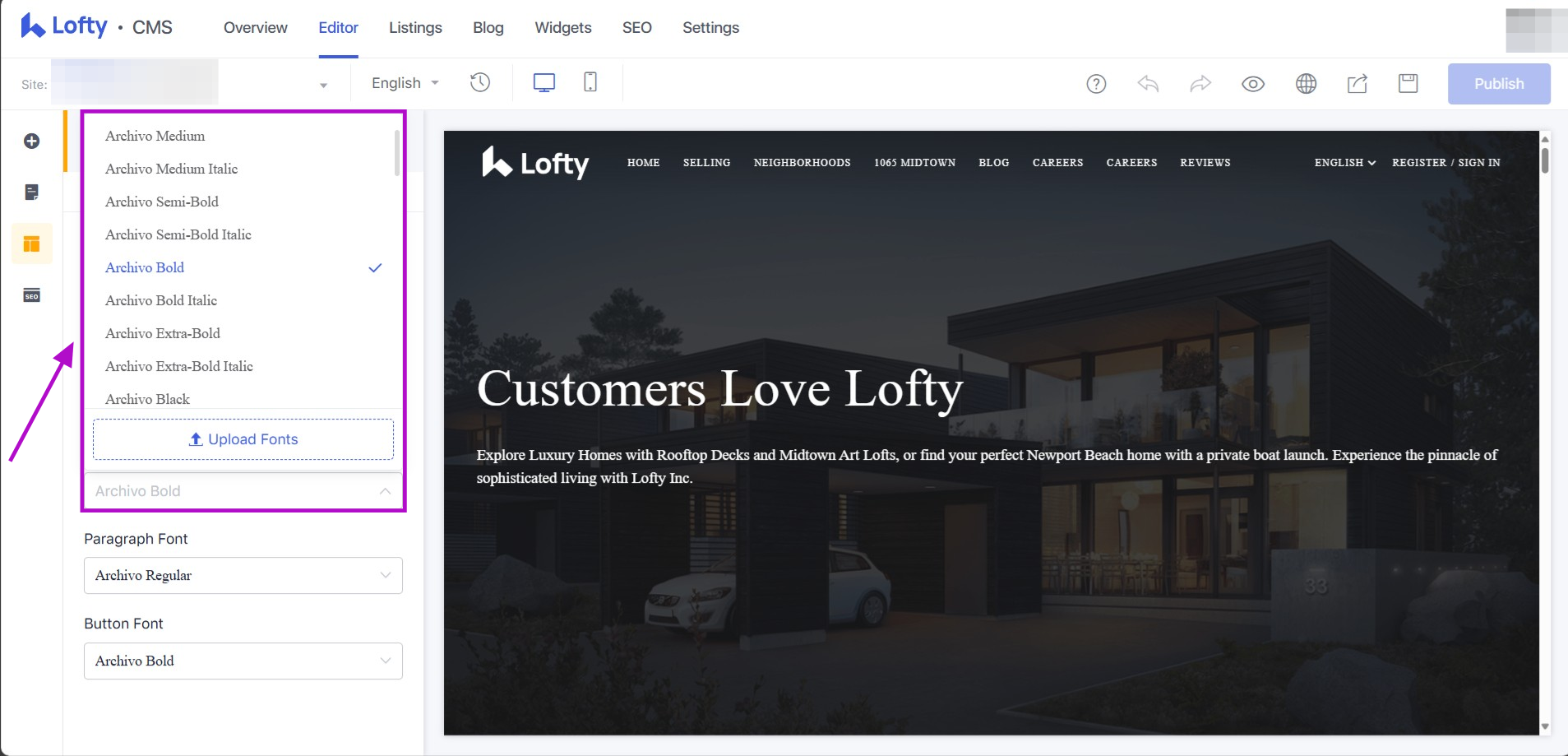 You can upload custom fonts to your Lofty website or choose from the 28 most popular fonts provided by Google.